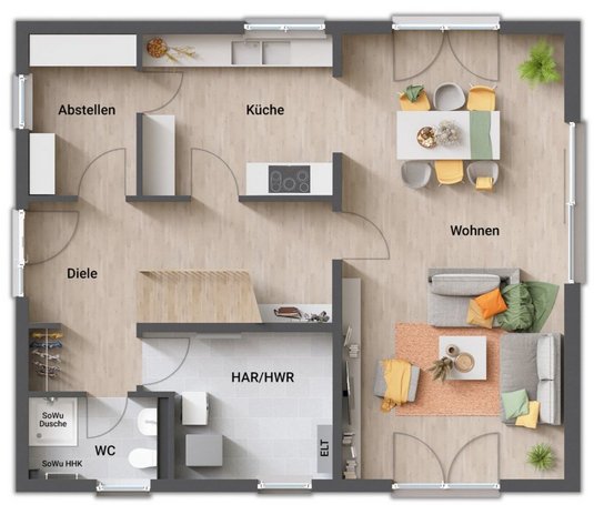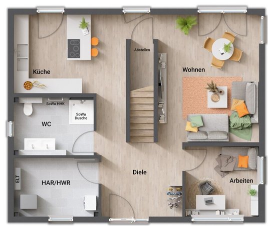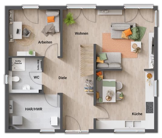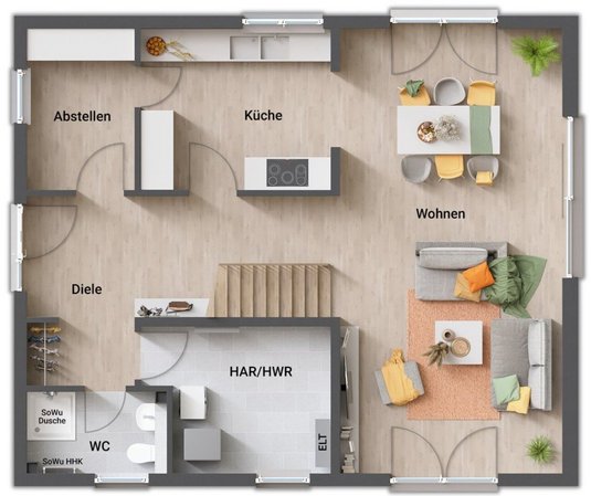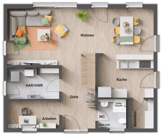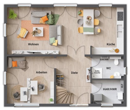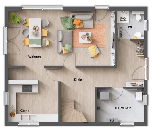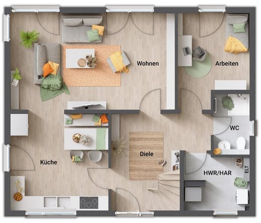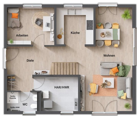 Der Mittelpunkt des Flair 152 RE ist der helle, weitläufige Wohn- und Essbereich im Erdgeschoss. Hier kommt die Familie zusammen - ob beim gemütlichen Abend auf dem Sofa oder beim Feiern mit Freunden. Große Fensterfronten eröffnen den Blick ins Grüne und verbinden Wohnraum und Terrasse zu einem harmonischen Innen-Außen-Bereich. Direkt angrenzend fügt sich die offene Küche ein, die mit viel Platz sowohl für gesellige Kochabende als auch für das schnelle Frühstück am Morgen ausgelegt ist.