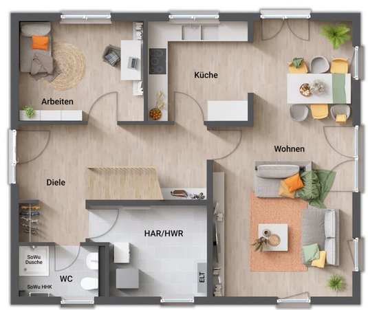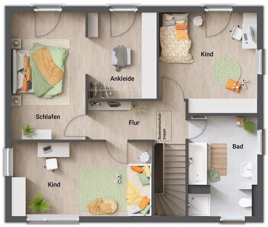 Im Obergeschoss setzt sich das durchdachte Raumkonzept fort. Drei großzügige Zimmer lassen sich flexibel als Schlaf-, Kinder- oder Gästezimmer nutzen - ganz nach Lebenslage. Dank der vollen Geschosshöhe wirken alle Räume durch die großen Fenster hell und freundlich. Besonders komfortabel: Das Elternschlafzimmer verfügt über eine eigene Ankleide, die reichlich Stauraum bietet. Ergänzt durch ein geräumiges Familienbad entsteht eine Wohlfühletage für jedes Familienmitglied. Gradlinig, schick und familiengerecht - das Flair 152 RE ist ein Stadthaus zum Wohlfühlen.