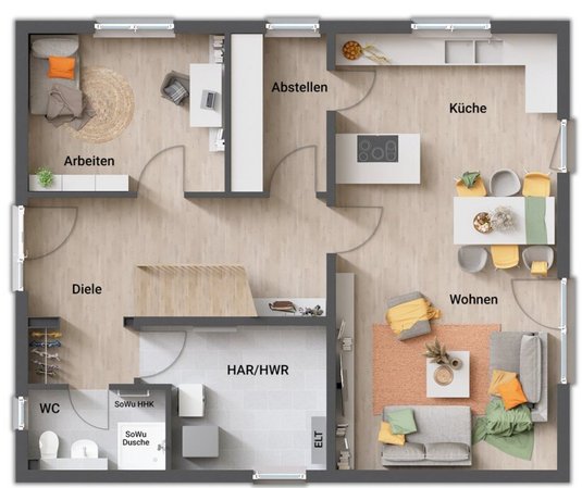Die kubische Bauform mit flachem Dach verleiht dem Flair 152 RE sein unverwechselbares Bauhaus-Design. Klare Linien und eine reduzierte Formensprache schaffen eine zeitlose Ästhetik, die modern und einladend zugleich wirkt. Bodentiefe Fenster sowie ein offenes Entrée mit Galerie lassen viel Tageslicht ins Innere strömen und betonen das großzügige Raumgefühl bereits beim Eintreten. Mit zwei Vollgeschossen und ohne Dachschrägen bietet dieses Stadthaus eine markante Silhouette und auf beiden Etagen volle Raumhöhe – ideal für ein komfortables Wohnambiente ohne Kompromisse.