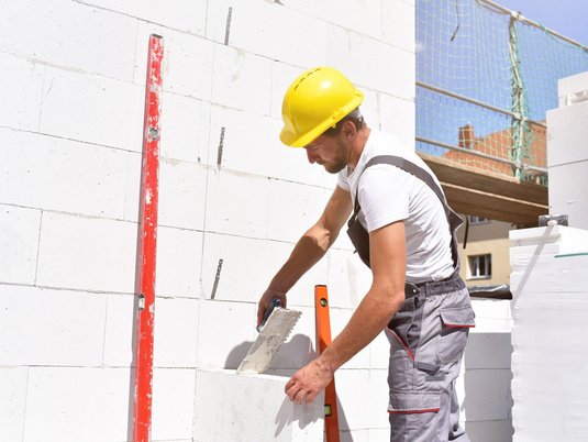 Stockwerk für Stockwerk mauern die Handwerker die Außen- und Innenwände aus Ziegeln, Kalksandstein oder Porenbeton. Nach jedem Geschoss folgt die Decke (entweder Ortbetondecke oder Montage einer Fertigdecke).