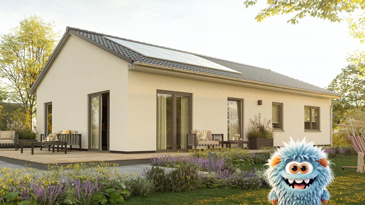 Durch die rechteckige Form profitieren Bauherren von Flexibilität und einem großzügigen Außenbereich, der ohne lästige Stufen begehbar ist. Die lichtdurchflutete Wohnfläche lässt insgesamt Platz für drei bis vier Zimmer. Die Küche ist Teil eines großzügigen Wohnbereichs mit direktem Zugang zum Garten. So können Sie Familienfeste und gemütliche Sommerabende direkt auf der Terrasse genießen. Ein großes Badezimmer und ein praktischer Hauswirtschaftsraum sind ebenfalls Teil des clever geplanten Grundrisses. Auch Kinder oder Gäste sind im Bungalow herzlich willkommen, da dieses Haus sich den Lebensbedürfnissen seiner Bewohner anpasst.