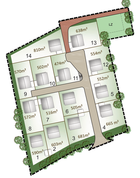 Fläche der Bauplätze: 502 m² - 744 m²