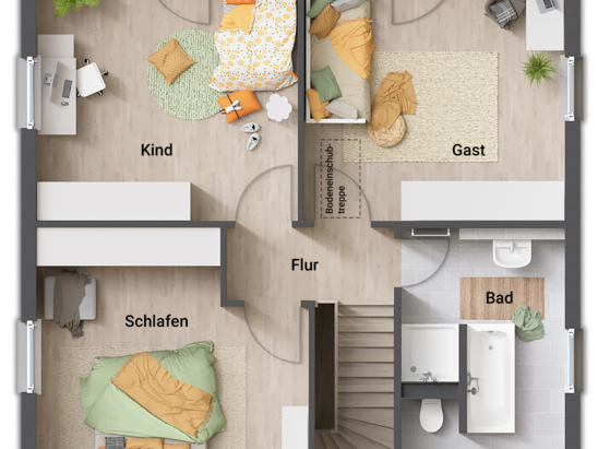 Ob offene Wohnküche, gemütliche Rückzugsorte oder flexible Kinderzimmer – jeder Raum wird nach deinen Wünschen gestaltet.