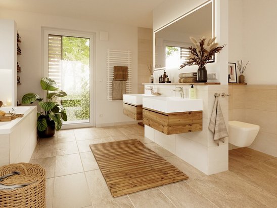 Helle Fliesen, warme Akzente und eine bodengleiche Dusche schaffen einen Raum, der morgens belebt und abends zur Ruhe kommen lässt.