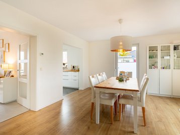 Das Flair 125 ist eines unserer beliebtesten Häuser. Und das zu Recht, denn es ist ein Haus mit besonderer Ausstrahlung. Eine Ausstrahlung, die sich schon beim ersten Blick zeigt: das weitläufige Wohnzimmer mit dem großen Essbereich ist ein absoluter Anziehungspunkt für die ganze Familie und für Gäste.
