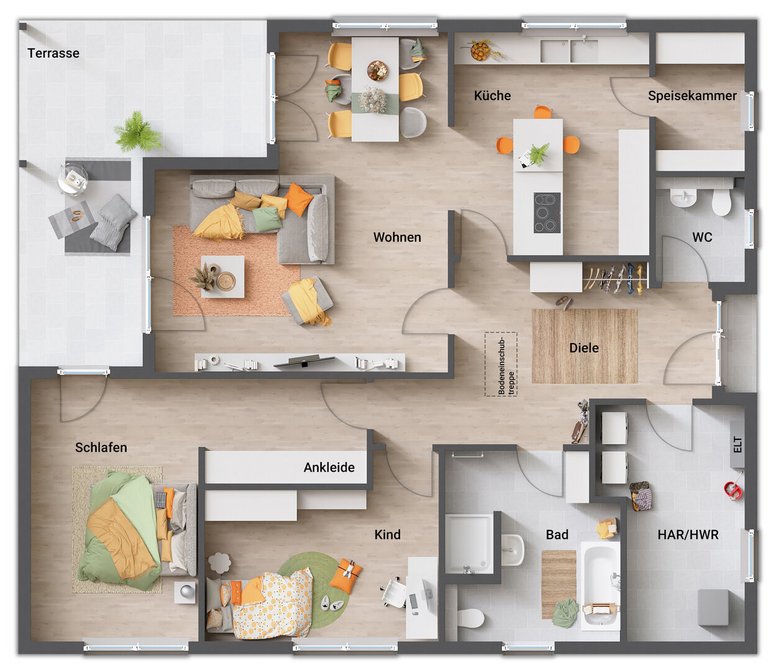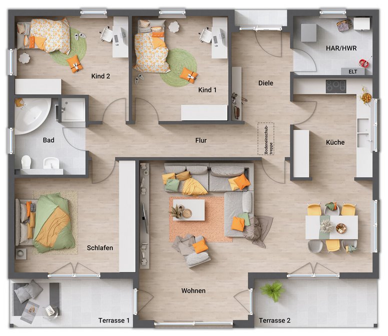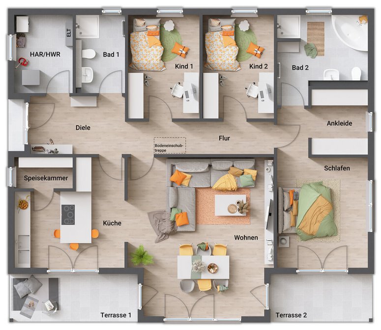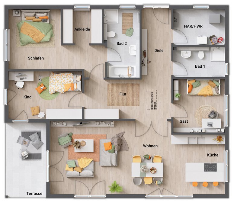ab Preis1 €Abbildungen enthalten Sonderwünsche die nicht Vertragsbestandteil sind, regionale Preis- und Ausstattungsänderungen möglich. Schlüsselfertig im Sinne dieses Angebotes bedeutet: ohne Tapezier- und Teppichverlegearbeiten.