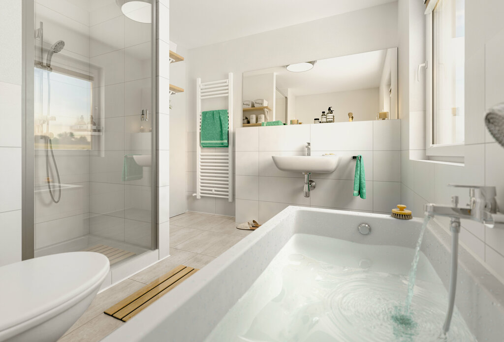 Anhand unseres beliebten Satteldach-Hauses "Flair 110" möchten wir Ihnen aufzeigen, welche Leistungen in der Vollausstattung im Hinblick auf den Einbau der Treppe enthalten sind. Dieser Haustyp steht für 110 Quadratmeter Wohnerlebnis. Ein Blickfang sind die bodentiefen Fenster, die den Wohnbereich mit viel Licht durchfluten.