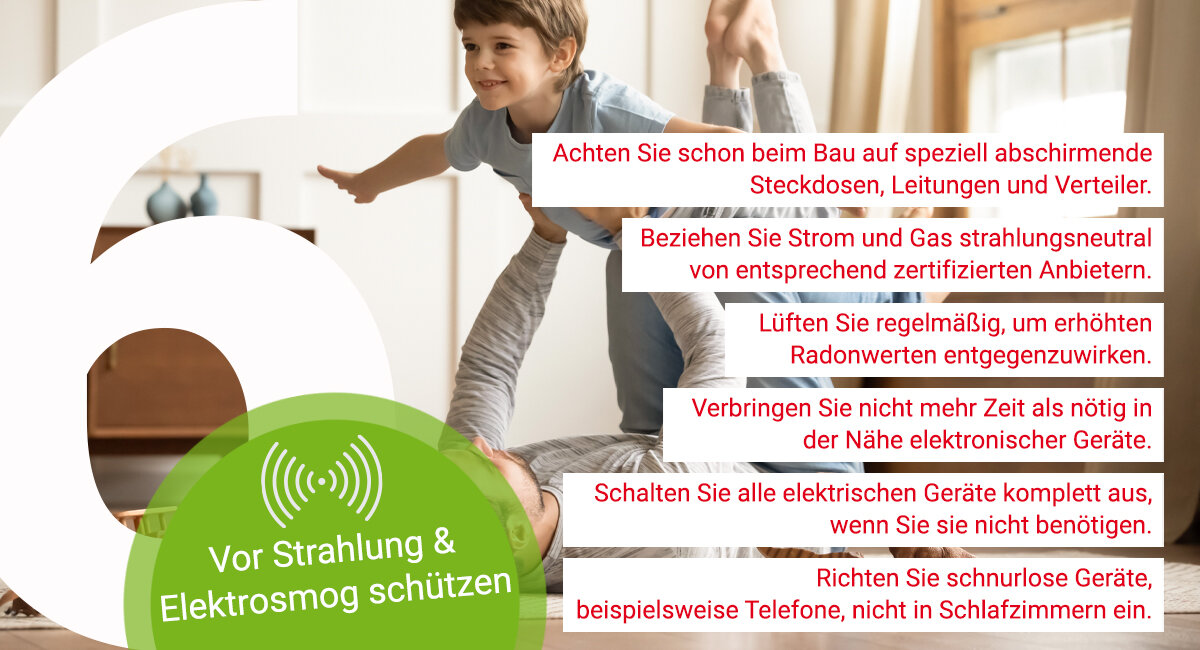 Die natürliche und künstliche Strahlung in unserem Umfeld kann ebenfalls dafür sorgen, dass die Wohngesundheit gemindert wird. Darüber hinaus besteht durch Elektrosmog aus elektrischen Geräten eine neue Herausforderung. Indem Sie sich über vorhandene Strahlung informieren und diese soweit wie möglich minimieren, können Sie das Risiko von Gesundheitsschäden wie Krebserkrankungen gezielt senken.