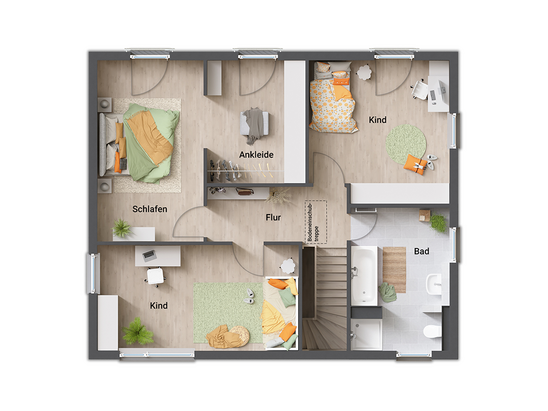 Auch das Obergeschoss zeigt sich im gradlinigen Baustil des Hauses. Hier finden Sie drei Zimmer, die Sie nach Ihren Vorstellungen als Schlaf-, Kinder- oder Gästezimmer nutzen können. Große Fenster lassen auch hier viel Tageslicht hineinströmen. Die Ankleide im Schlafzimmer bietet viel Stauraum.