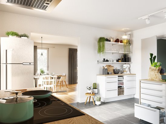 In der Küche haben Sie genug Platz für gemeinsame Kochabende mit den Liebsten oder ein schnelles Frühstück unter der Woche. Wer hin und wieder lieber im Home-Office arbeitet, kann sich neben dem Wohnzimmer ein Arbeitszimmer einrichten.