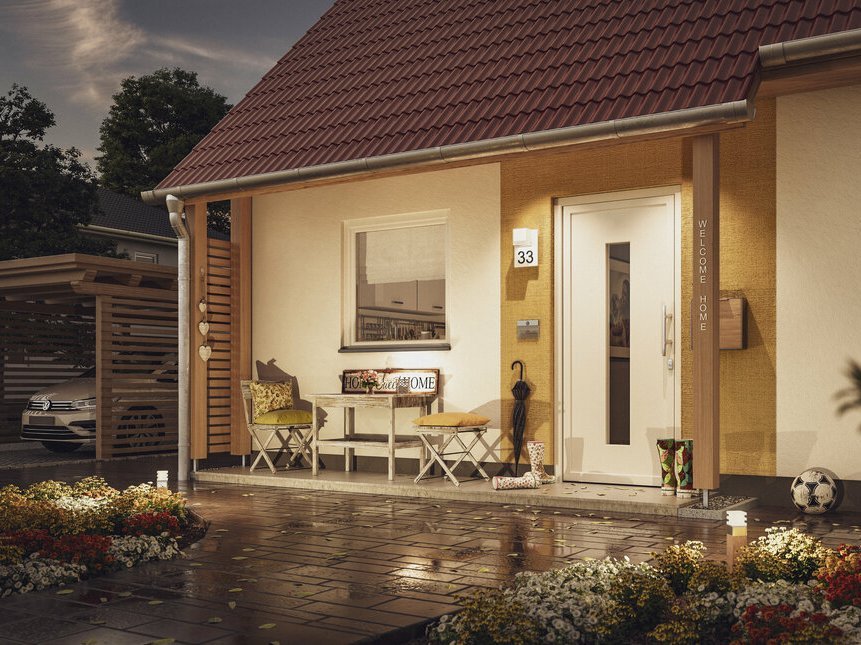 Stellen Sie sich vor… Ihre Kinder kommen abends vom Spielen nach Hause, während Sie nach einem langen Tag ein Glas Wein vor Ihrer Haustür genießen. Das Laufrad wird einfach an die Hauswand des Massivhauses gelehnt. Dank des neuen, robusten „Besenzug“-Putzes ist das kein Problem. Die sandigen Schuhe der Kinder bleiben vor der Haustür liegen. Es kann nichts passieren, sie stehen ja überdacht. Während Sie einen Schluck Wein trinken, lassen Sie den Blick über Ihren Vorgarten schweifen und winken dem Nachbarn zu, der gerade mit dem Hund seine Abendrunde läuft. Sie fühlen sich rundum wohl in Ihrem Zuhause. Plötzlich fängt es an zu regnen. Aber auch der kurze Schauer kann Ihre gute Stimmung nicht trüben, denn Sie sitzen trocken und geschützt unter dem Vordach Ihres Town & Country Massivhauses.