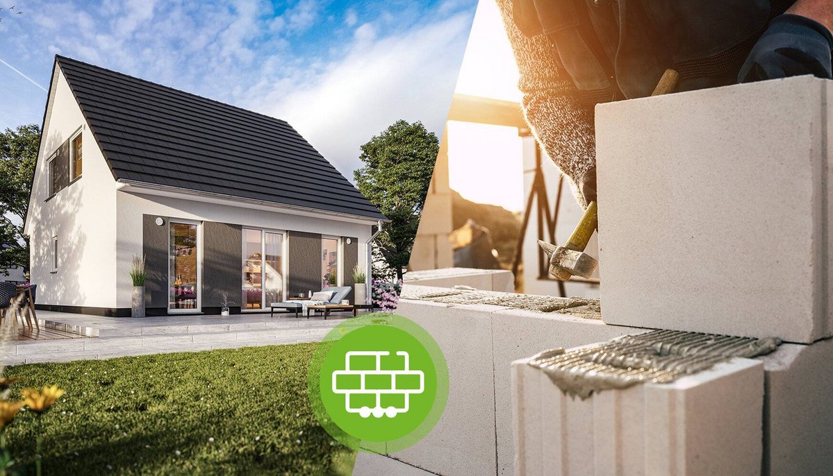 Erfahrungsgemäß wurde ein sogenanntes KfW 55 Haus mit einer Gebäudehülle von 42,5 Zentimetern gebaut. Das bedeutete für Bauherren Mehrkosten. Um die Anforderungen an ein Effizienzhaus 55 zu erfüllen, wurde die Gebäudehülle des Massivhauses angepasst, wobei Sie durch das dickere Mauerwerk lediglich 400 Kilowattstunden pro Jahr einsparen, also umgerechnet 12 Euro Heizkosten pro Monat. Mit dem Neubarstandard „Effizienzhaus GEG 2023“ können Sie auf den Primärenergiebedarf bauen und beim Jubiläumshaus Flair 110 bis zu 20.000 Euro sparen.* Inklusive Luft-Wasser-Wärmepumpe für Ihr energieeffizientes Massivhaus.